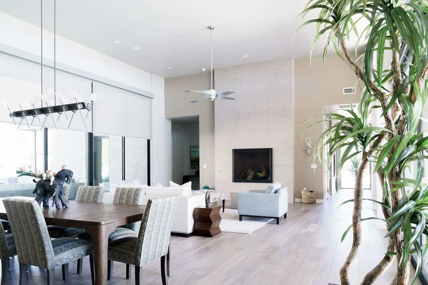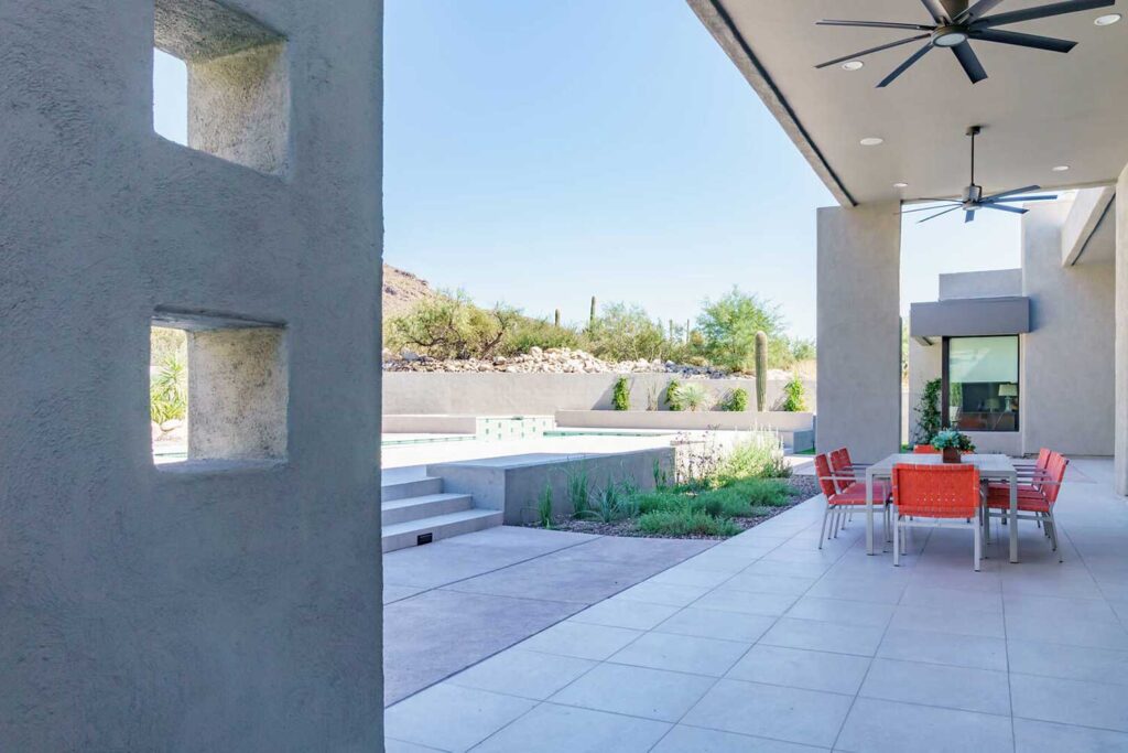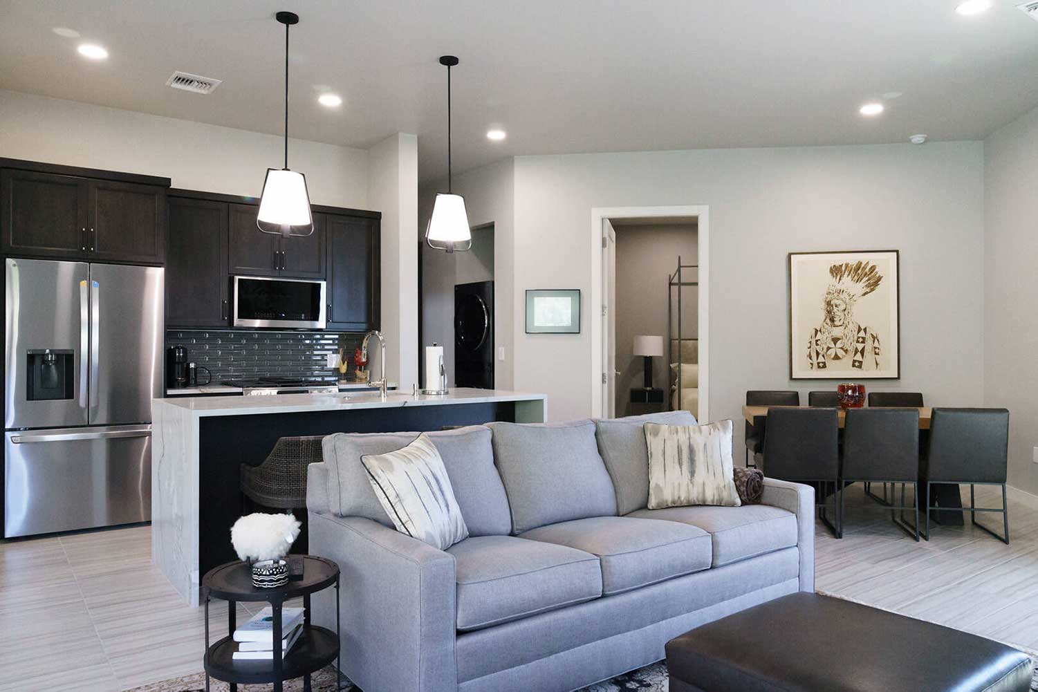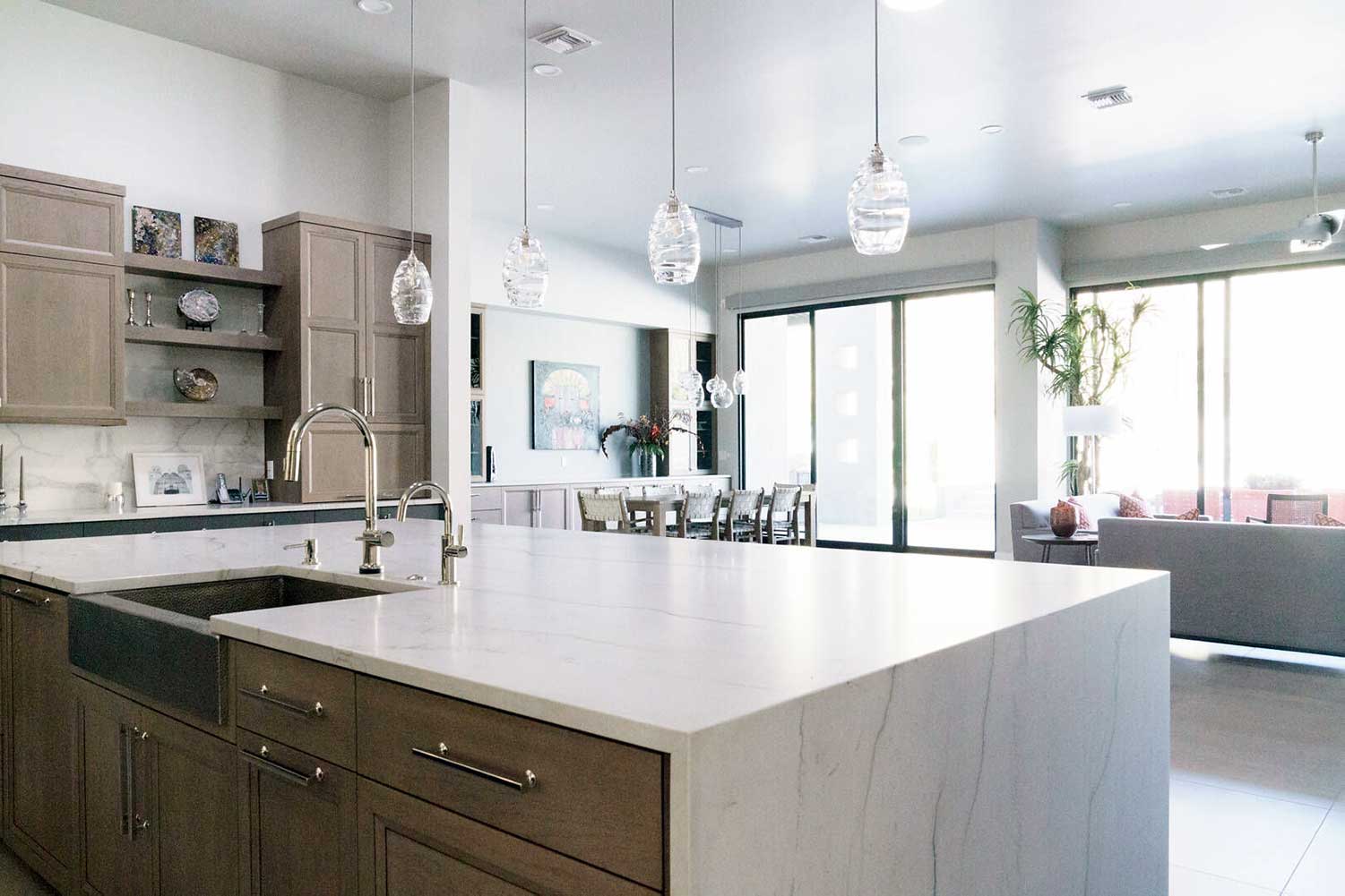 Natural materials, neutral tones, and an open layout seamlessly connect this custom home to its desert surroundings. Custom built-ins and layered lighting improve flow and function, while two-toned cabinetry adds subtle contrast. Large windows and custom window treatments bring in natural light.