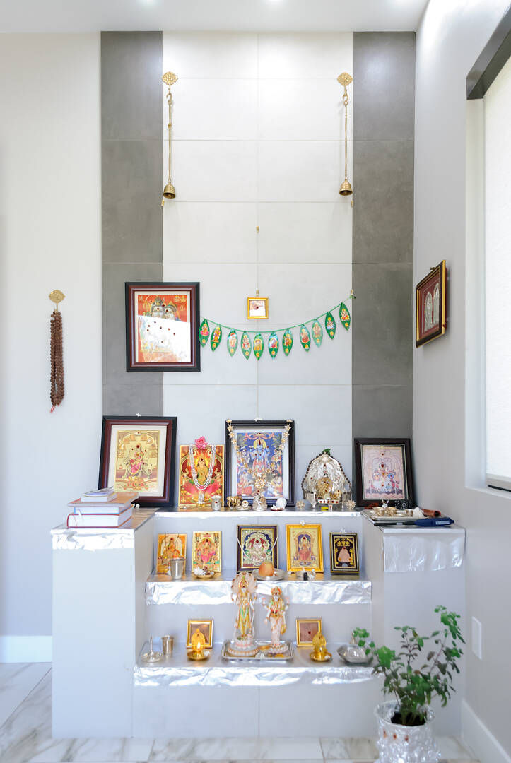 Sleek white marble floors and countertops establish a luminous canvas while dark niches and cabinetry offer bold contrast. Geometric pendant lighting and minimalistic features create a stunning modern feel.